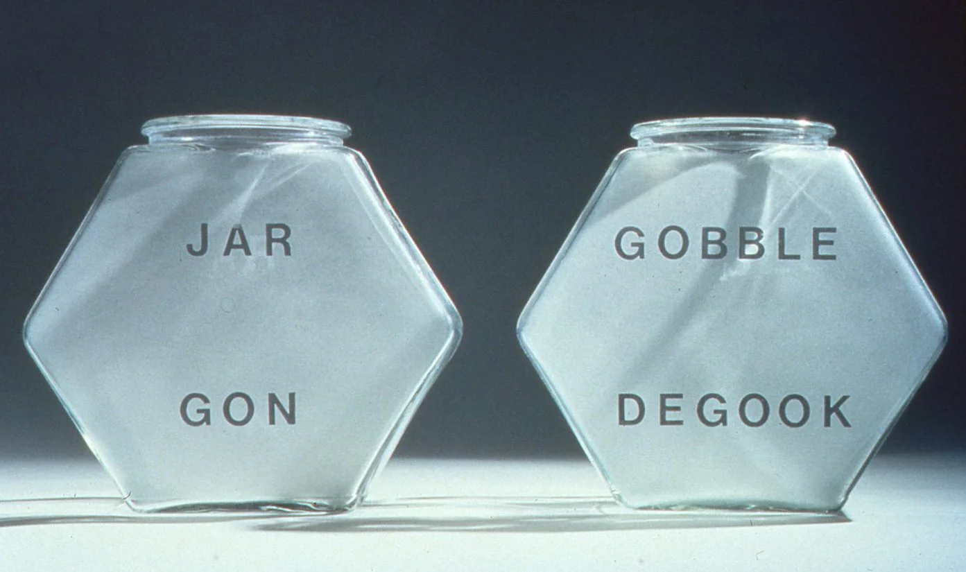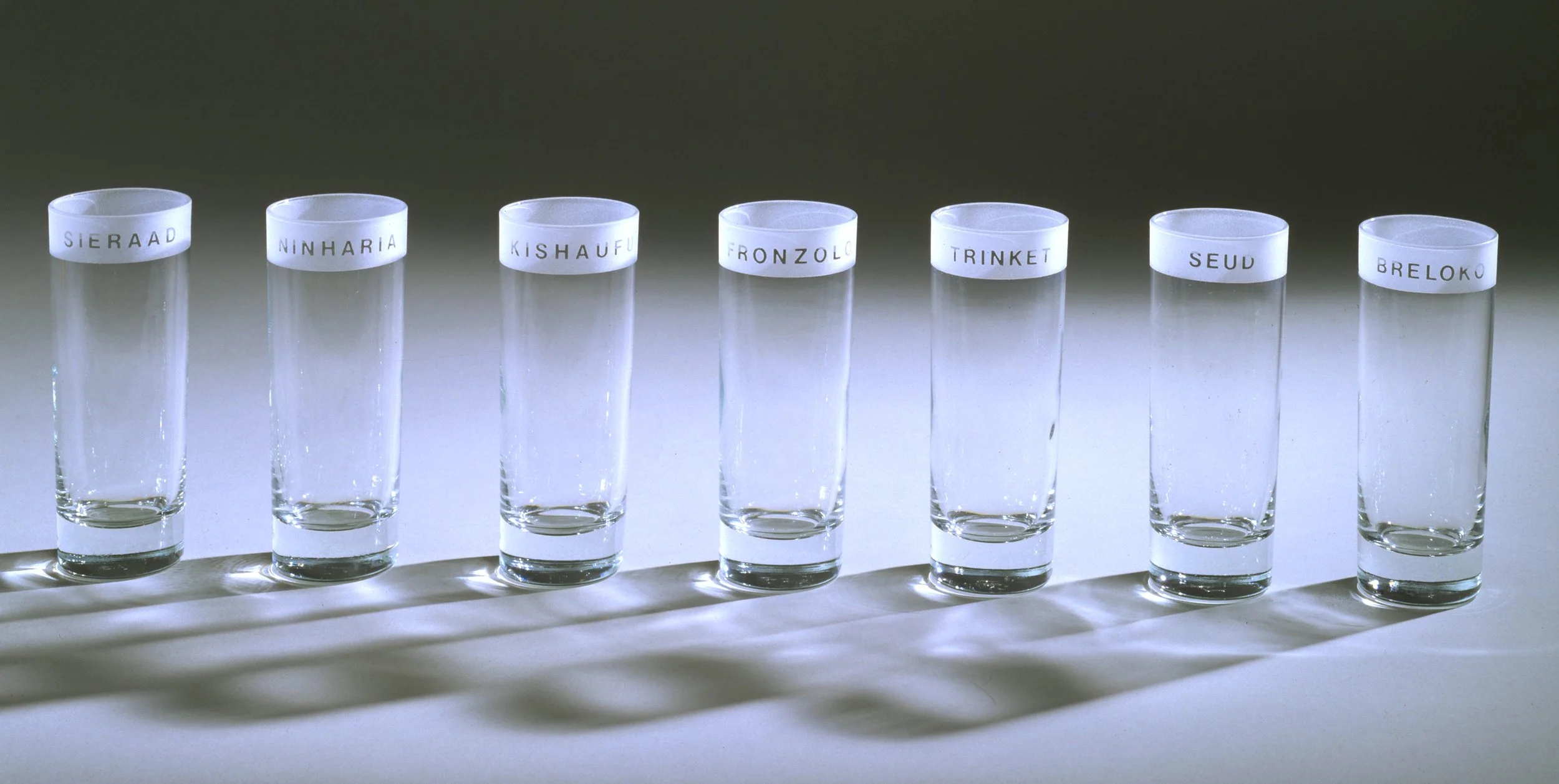 Acronym Set (detail), 1991, sandblasted glassware, set of 8, edition of 10, each 7” x 4” x 4”.