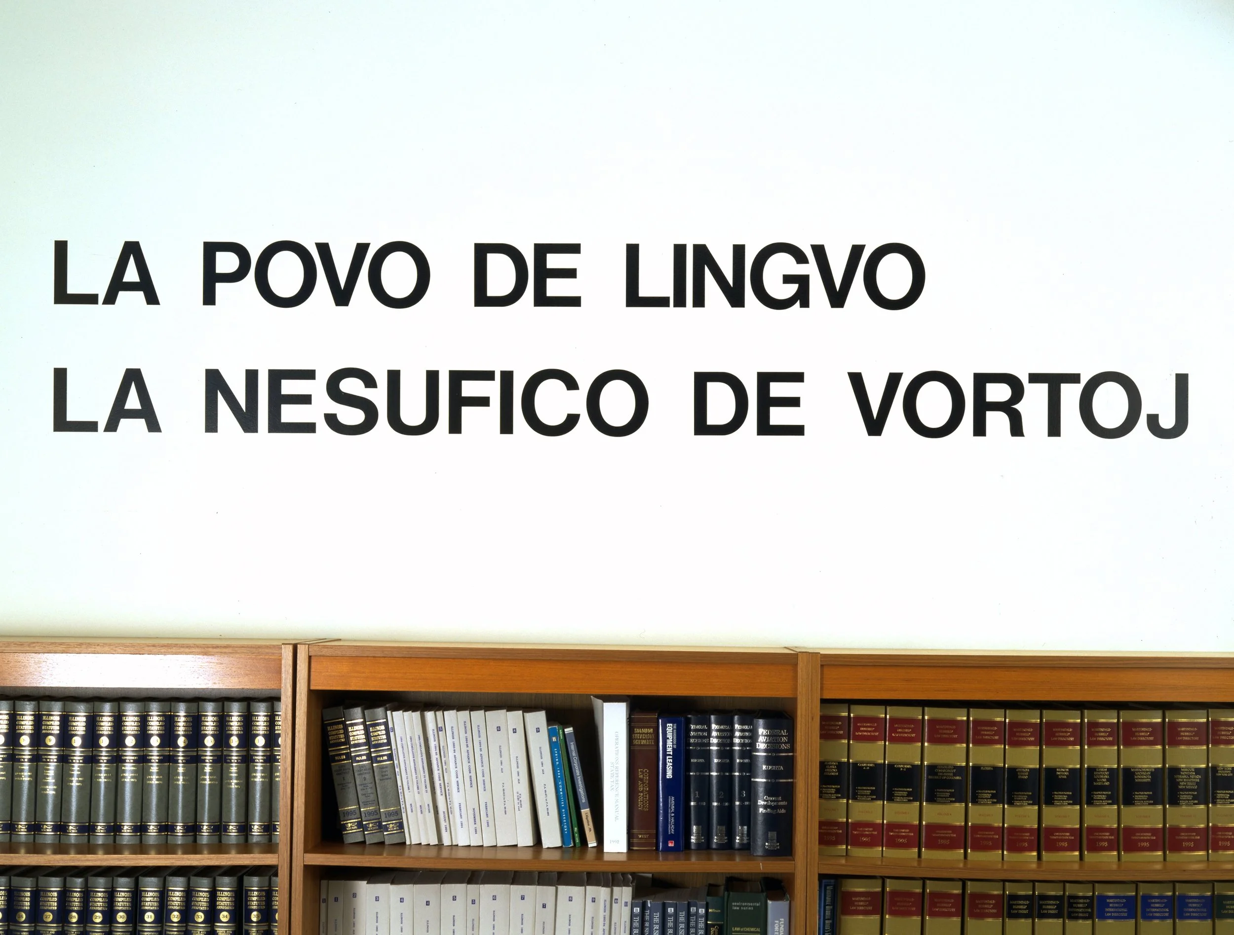 “ (Adam) Brooks titled one of his exhibitions "La Pova de Lingvo, La Nesufico de Vortoj," an Esperanto phrase meaning, "The power of language, the inadequacy of words." His work to date has been an effort to reveal the degree to which we still are residents in a global — and local! - Tower of Babel, forever separated from each other by the very communicative system we had believed united us. The poignancy of Esperanto, its doomed effort at collapsing the linguistic walls that divide humankind, continues to make it of special interest to Brooks.”