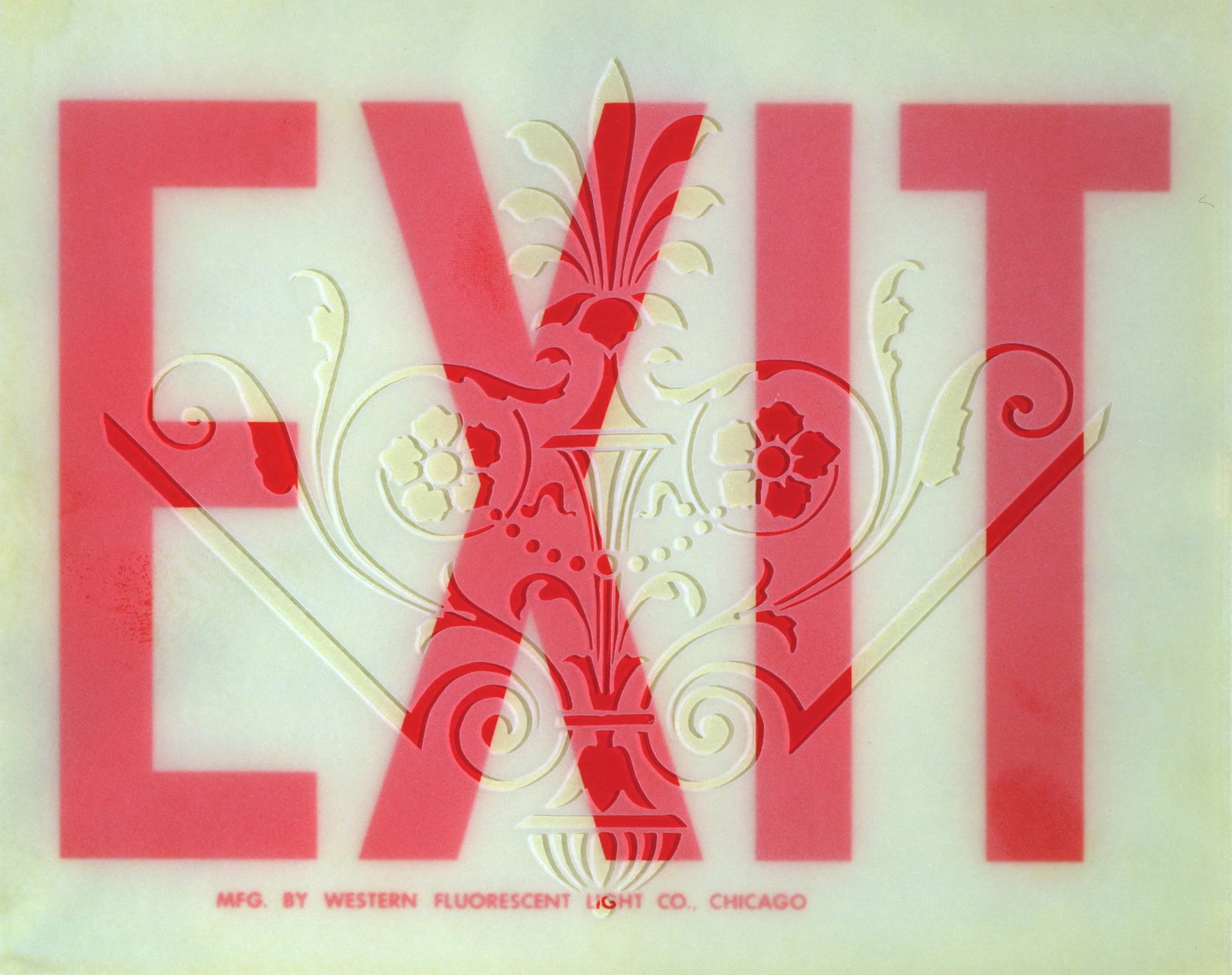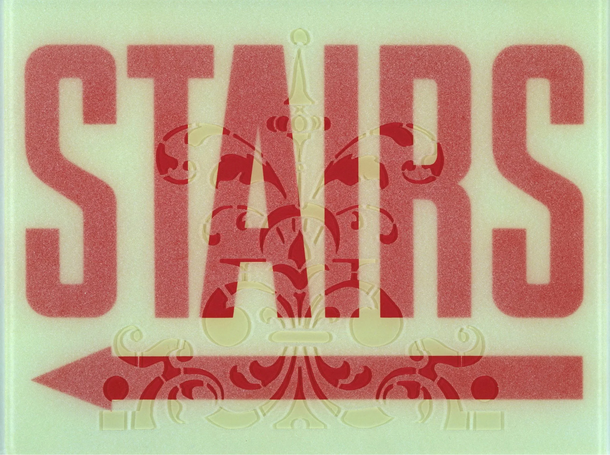 For this project Adam Brooks worked with the Exit signs of the building complex. His stenciling and sandblasting created contrasting matte and reflective areas with which the external light plays, causing the detail to be more or less noticeable depending on light levels and the viewer's distance. This is a subtle project which itself has no overtly religious connotations and could as easily be installed in an entirely secular space.