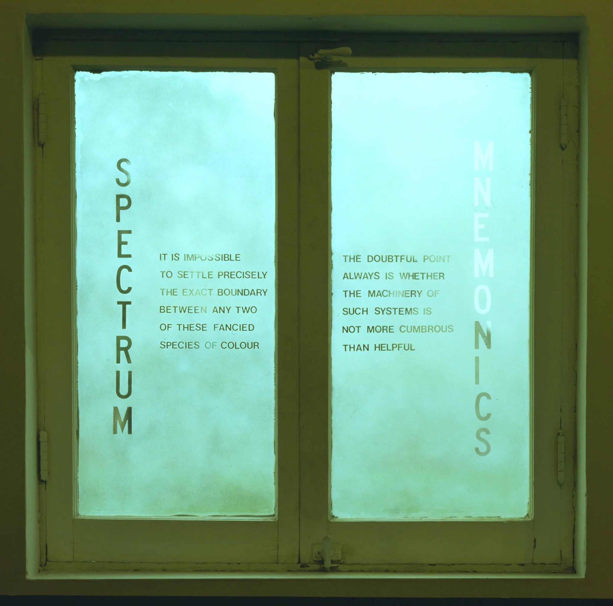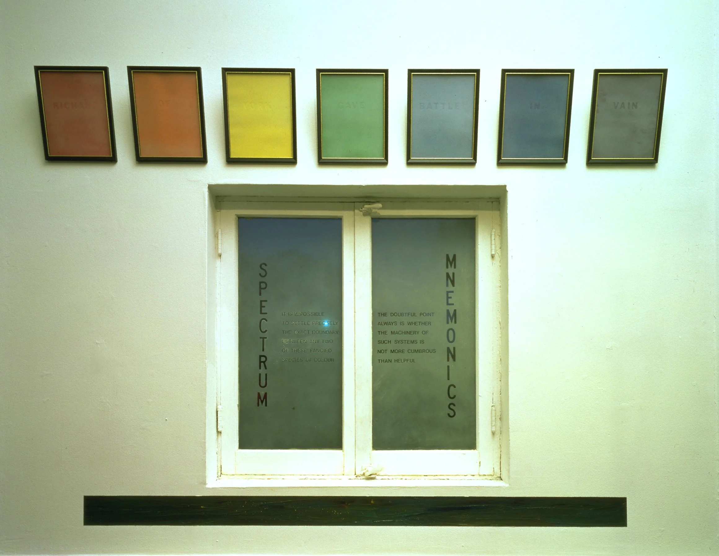 Spectrum Mnemonic, 1989, installation at Prairie Avenue Gallery, Chicago, incorporating sandblasted glass, wood, frames, colored paper, acrylic paint, 97” x 77” x 7”.